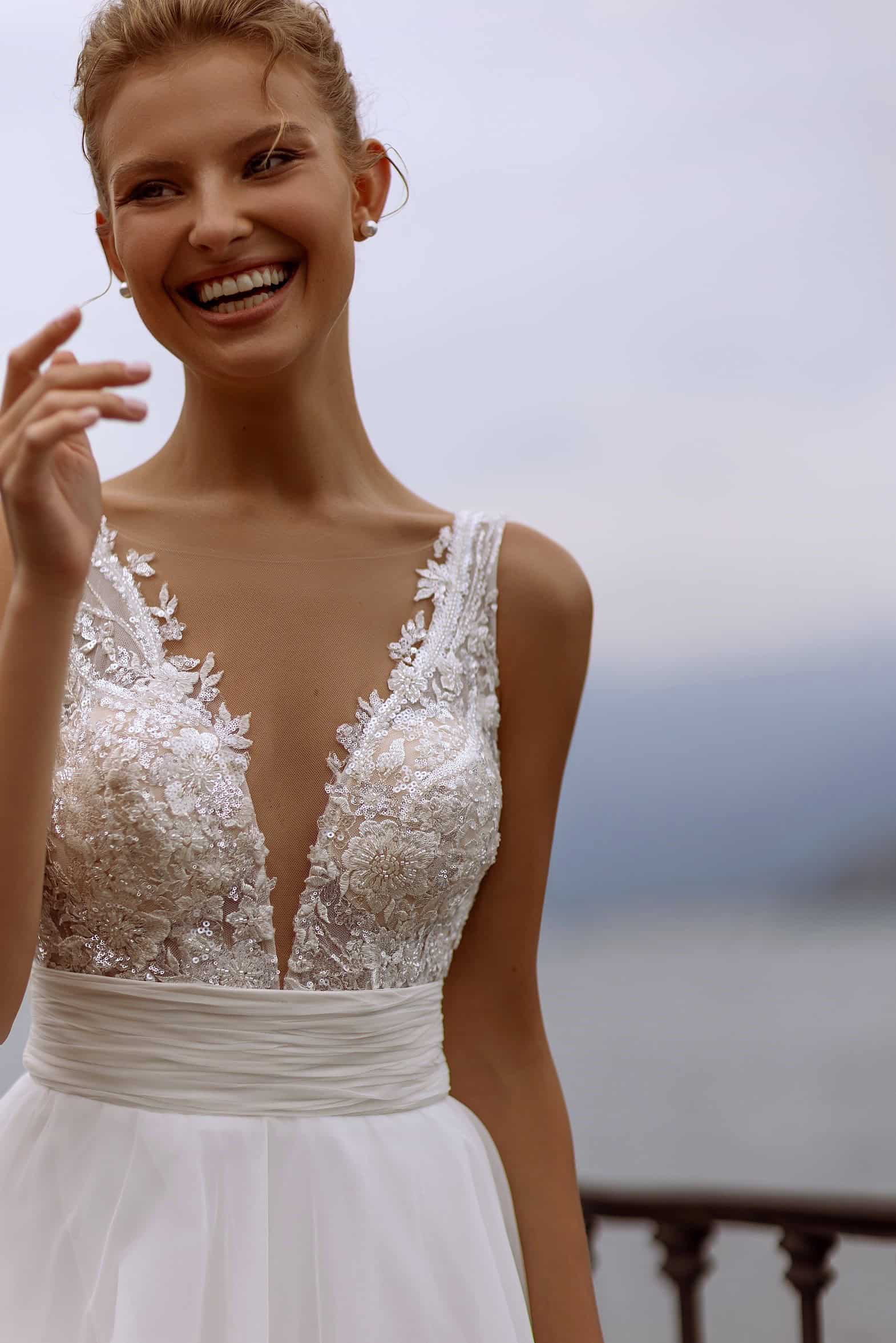 A felsőrész illúzió csipkéből készült, amely finoman áttetsző hatást kelt. A mély V-kivágás nőies karaktert ad a ruhának, miközben megőrzi az elegáns összhatást. Ez a részlet különösen előnyös, ha szeretnéd hangsúlyozni a felsőtest vonalait.