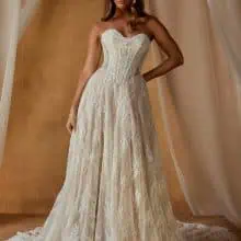 A pánt nélküli, szív alakú dekoltázs illúzió felsőrésszel és látható fűzőmerevítéssel találkozik, amely gyönyörűen formálja az alakot, miközben megőrzi a ruha könnyed eleganciáját. A zsinórozott csipkemotívumok tudatos elhelyezése kiemeli a nőies vonalakat anélkül, hogy elnehezítené az összhatást.
