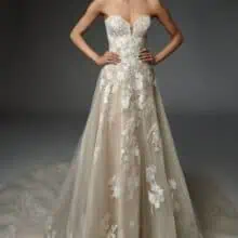 A Hyacinthe esküvői ruha az Enzoani kollekció egyik leglátványosabb darabja, amely a romantika és az elegancia tökéletes összhangját teremti meg. Ez a pántnélküli A-vonalú esküvői ruha finoman kiemeli a nőies vonalakat, miközben a légies tüll és a különleges virágmotívumos csipkedíszítés mesés megjelenést biztosít.