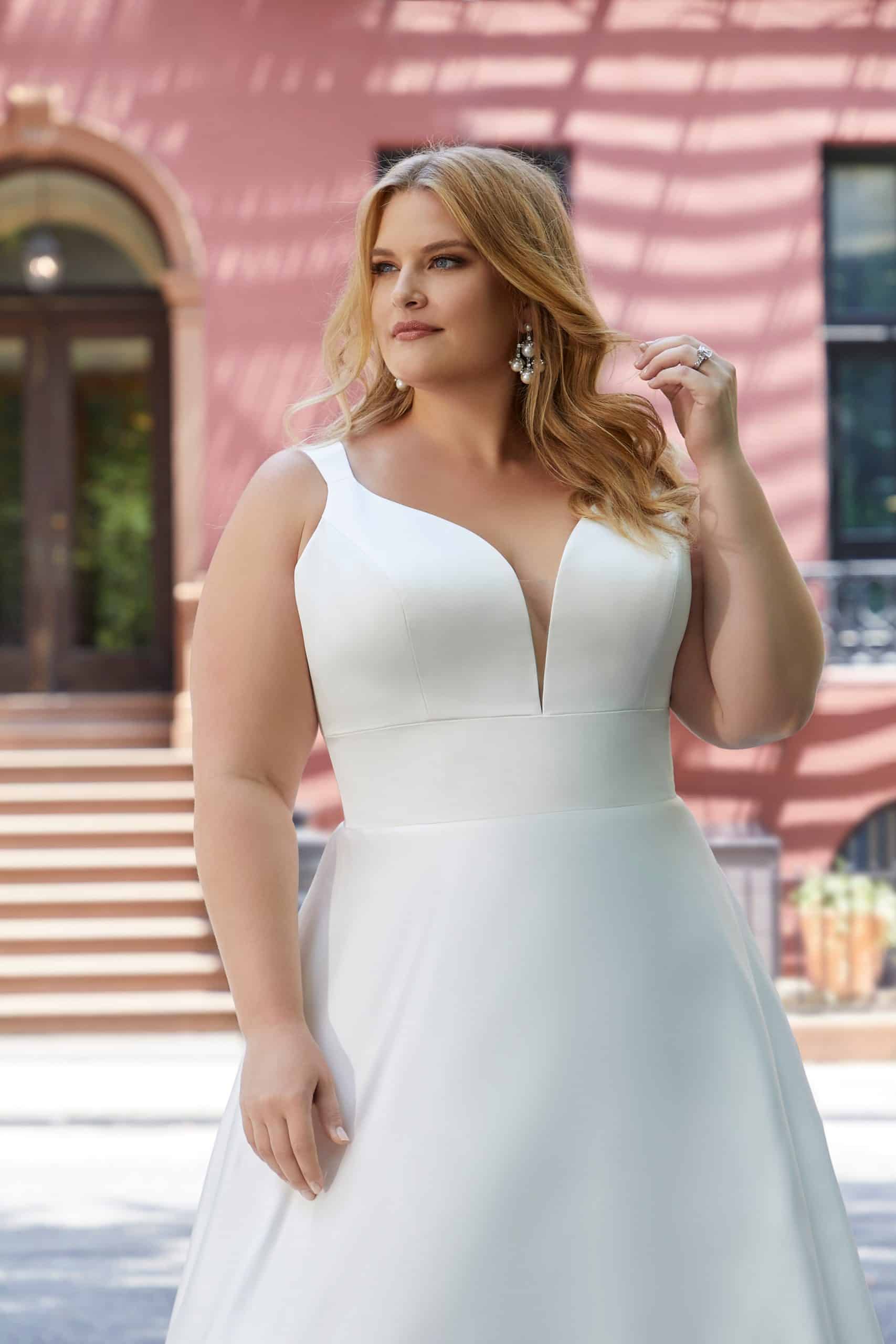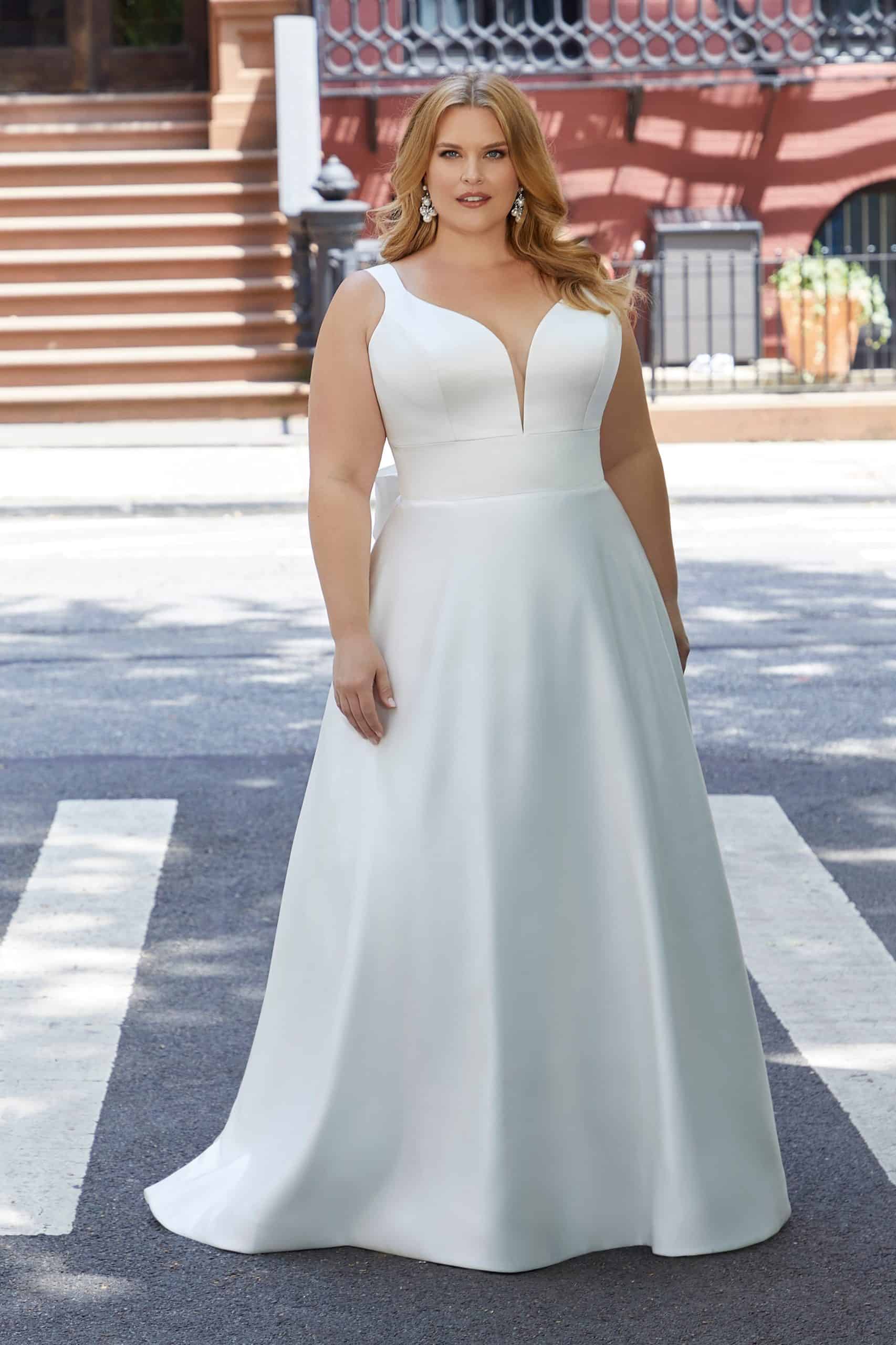 A plus size menyasszonyi ruha fazonok között az A-vonalú Harlow modell az elegancia megtestesítője. Letisztult vonalvezetése időtálló megjelenést biztosít, miközben a különleges fényű szatén anyag luxus hatást kölcsönöz. Ez a ruha ideális választás azoknak a menyasszonyoknak, akik minimalista stílus mellett szeretnének nőies és kifinomult megjelenést.