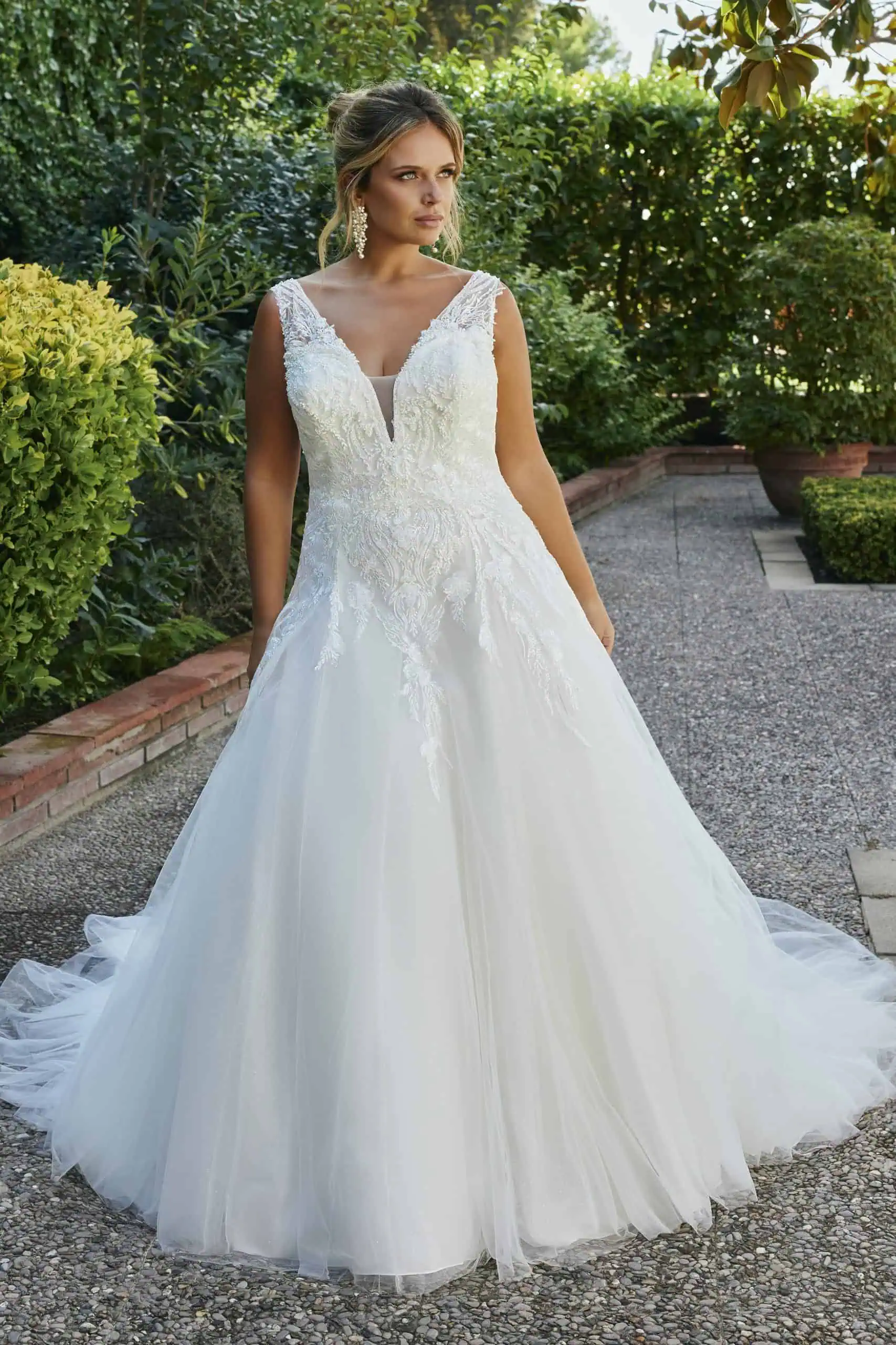 A Veni Infantino 19005 egy igazán különleges plus size esküvői ruha puffos ujjal, amely elegánsan ötvözi a romantikus részleteket a modern menyasszonyi divattal. A finoman kialakított A-vonalú szabás karcsúsít, miközben harmonikusan követi a nőies vonalakat, a könnyed tüllszoknya pedig légies, mesebeli hatást kölcsönöz.