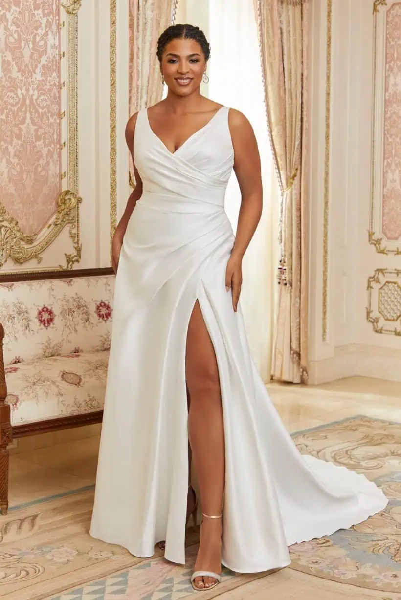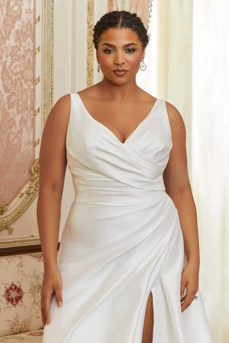 A finoman drapírozott felsőrész nőiesen formálja az alakot, miközben a V-nyakkivágás optikailag nyújtja a felsőtestet és kiemeli a dekoltázst. Az A-vonalú szabás különösen előnyös plus size menyasszonyok számára, mivel hangsúlyozza a derekat, miközben lágyan követi a test vonalát.
