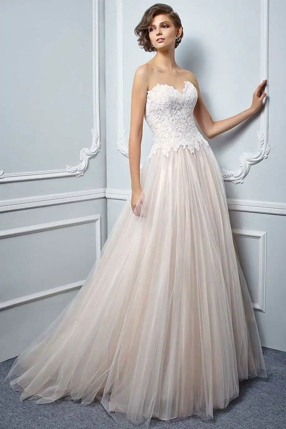 Az A-vonalú szabás időtálló, és szinte minden testalkaton előnyösen mutat. A finom tüll és a részletgazdag csipke kombinációja romantikus és elegáns hatást kölcsönöz a ruhának. A púder árnyalat különleges alternatívát kínál a hagyományos fehér menyasszonyi ruhákhoz, így azoknak a menyasszonyoknak is tökéletes választás, akik egy kis egyediséget szeretnének csempészni megjelenésükbe.
