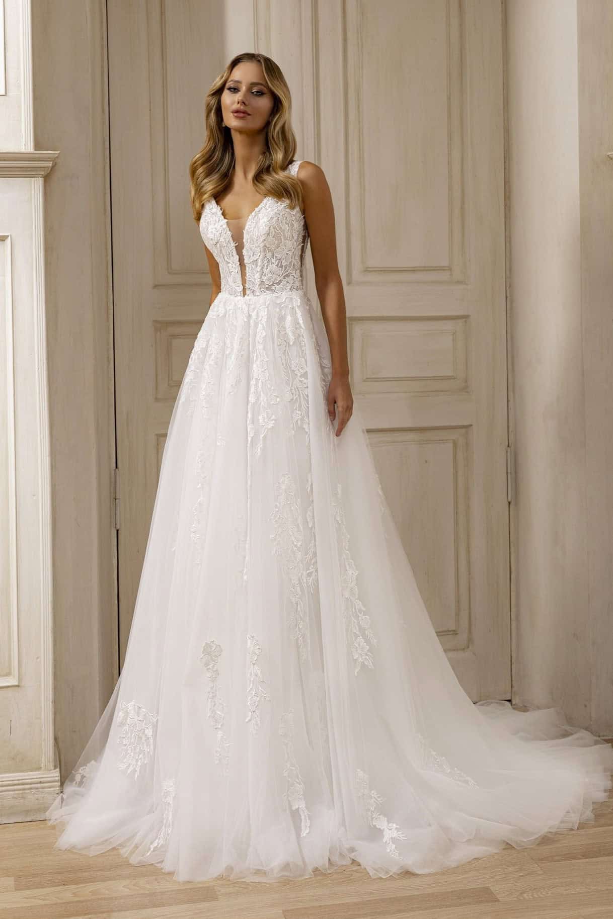 Az áttetsző hatású illúzió felsőrész gazdagon díszített csipkével készült. Finoman sejteti a bőrt, miközben stabil tartást ad. Ettől válik a ruha egyszerre sejtelmessé és elegánssá.