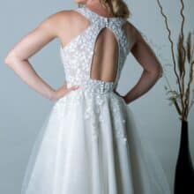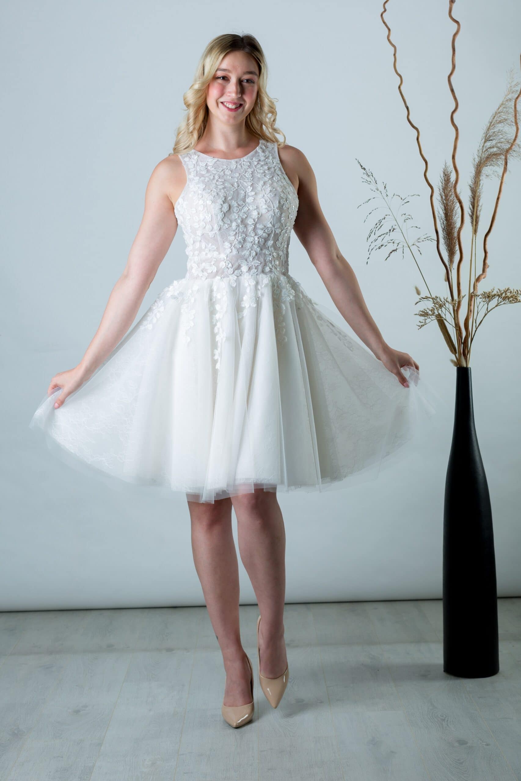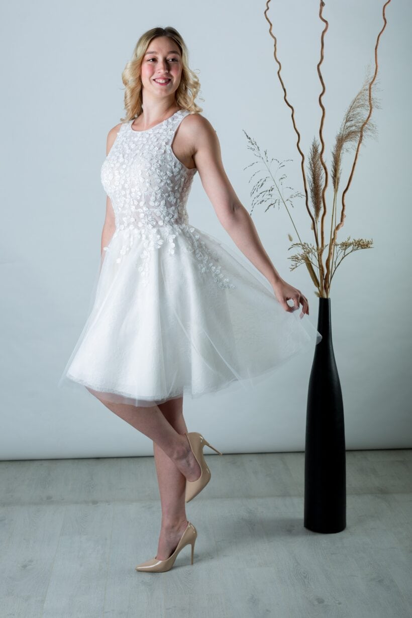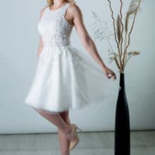 A térdig érő fazon friss és trendi. Ugyanakkor elegáns marad, így polgári esküvőre, nyári ceremóniára vagy akár második ruhának is tökéletes. A könnyed szabás szabad mozgást biztosít, ami különösen fontos egy egész napos ünneplés során.