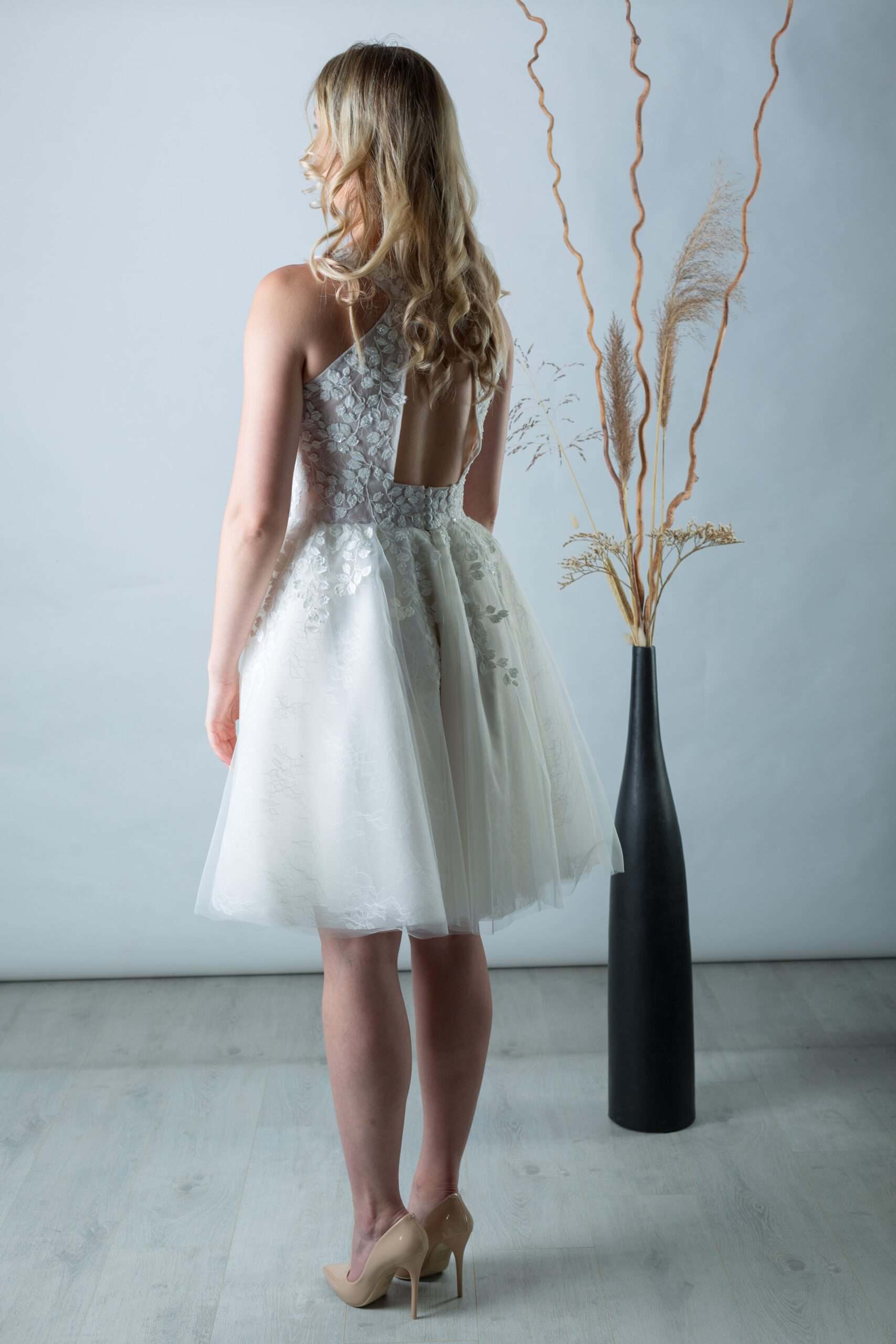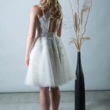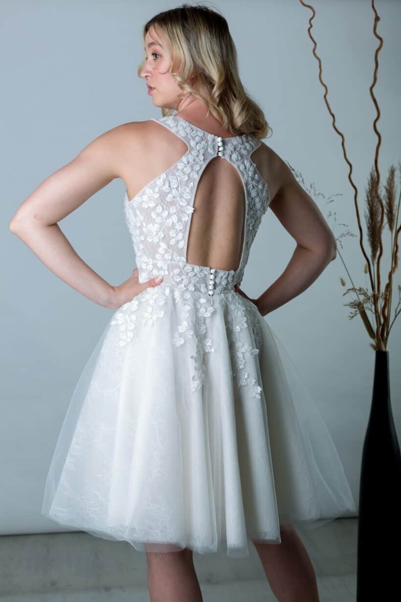 A hátul elhelyezett kulcslyuk kivágás különleges, mégis visszafogott részlet. A gombos záródás finom eleganciát sugároz. Ezek az apró megoldások teszik igazán egyedivé ezt a rövid tüll esküvői ruhát.