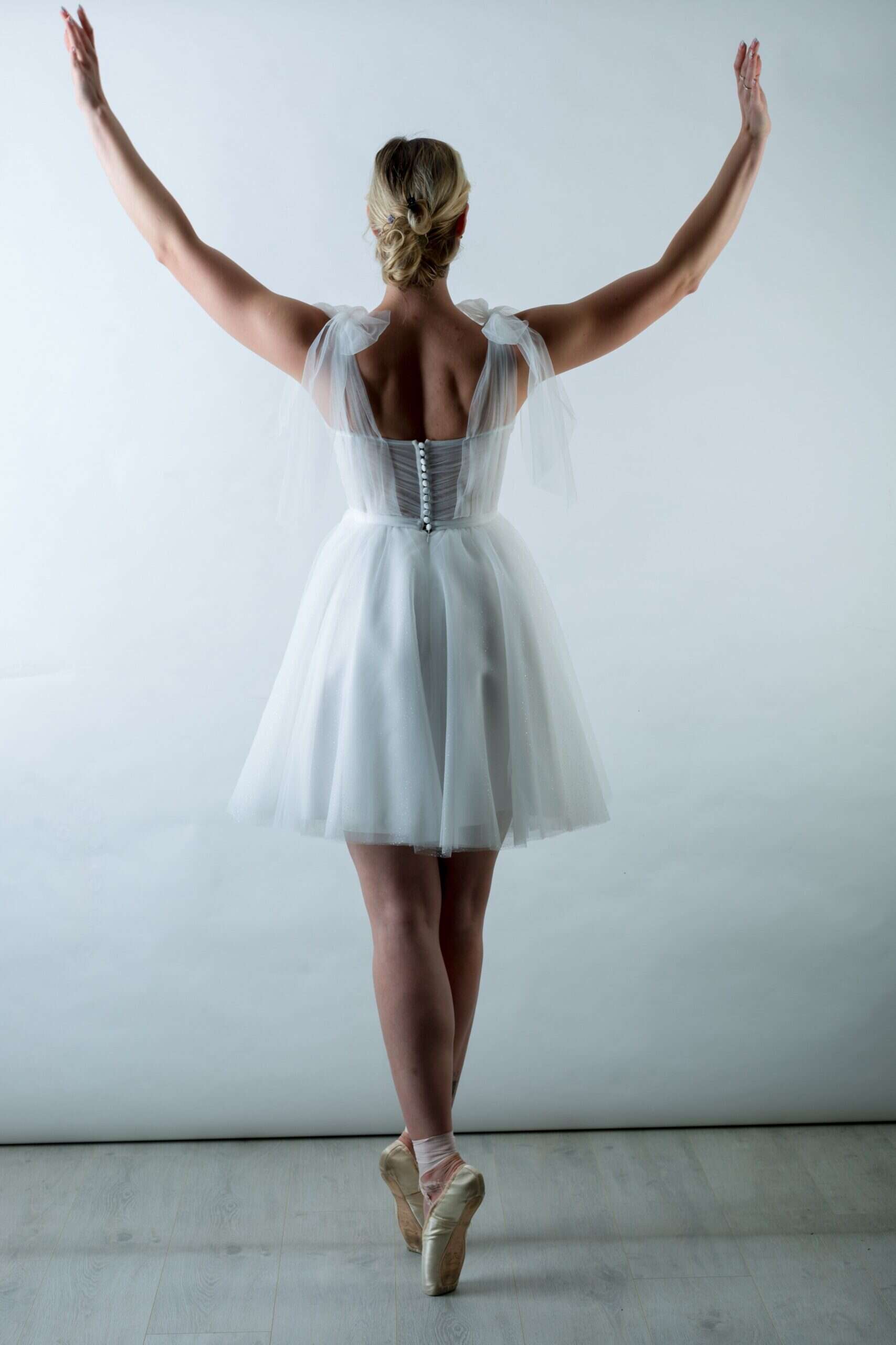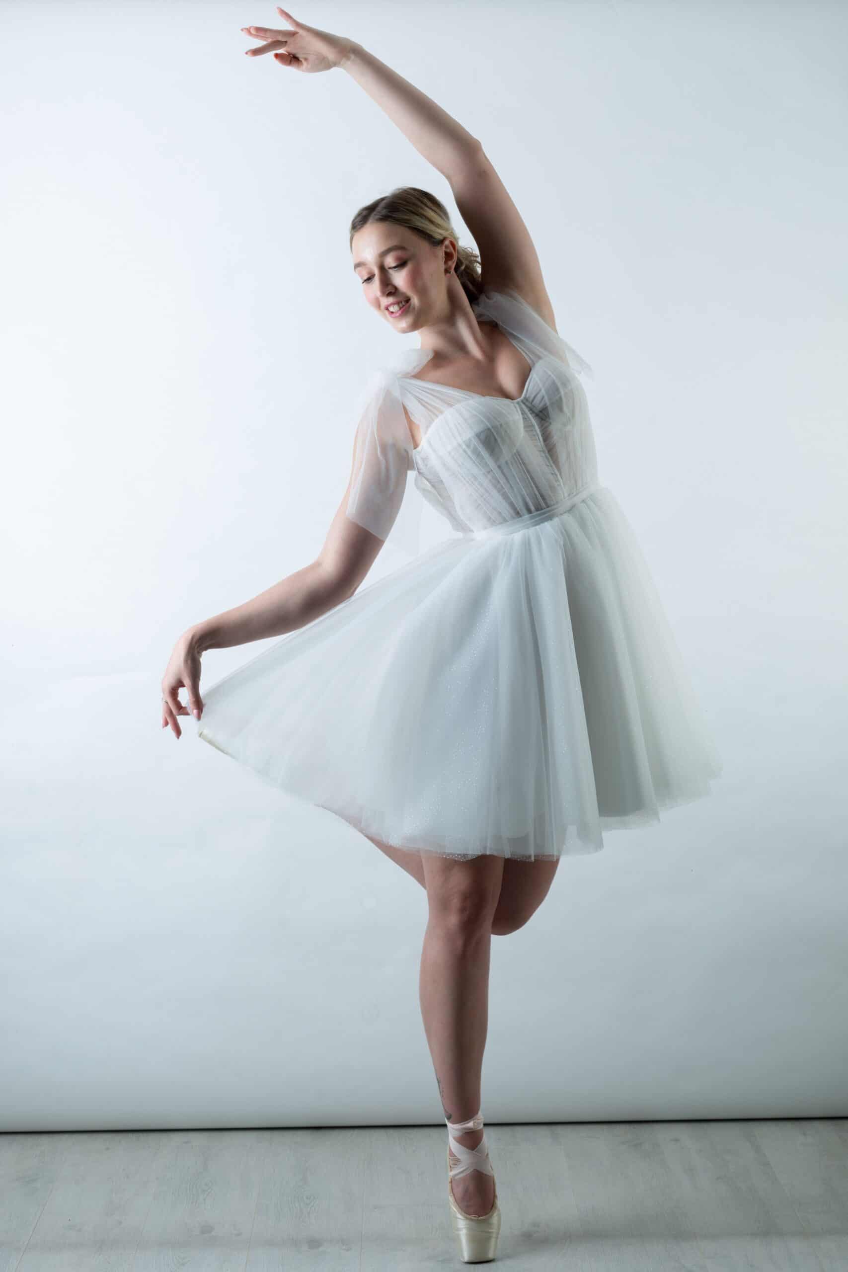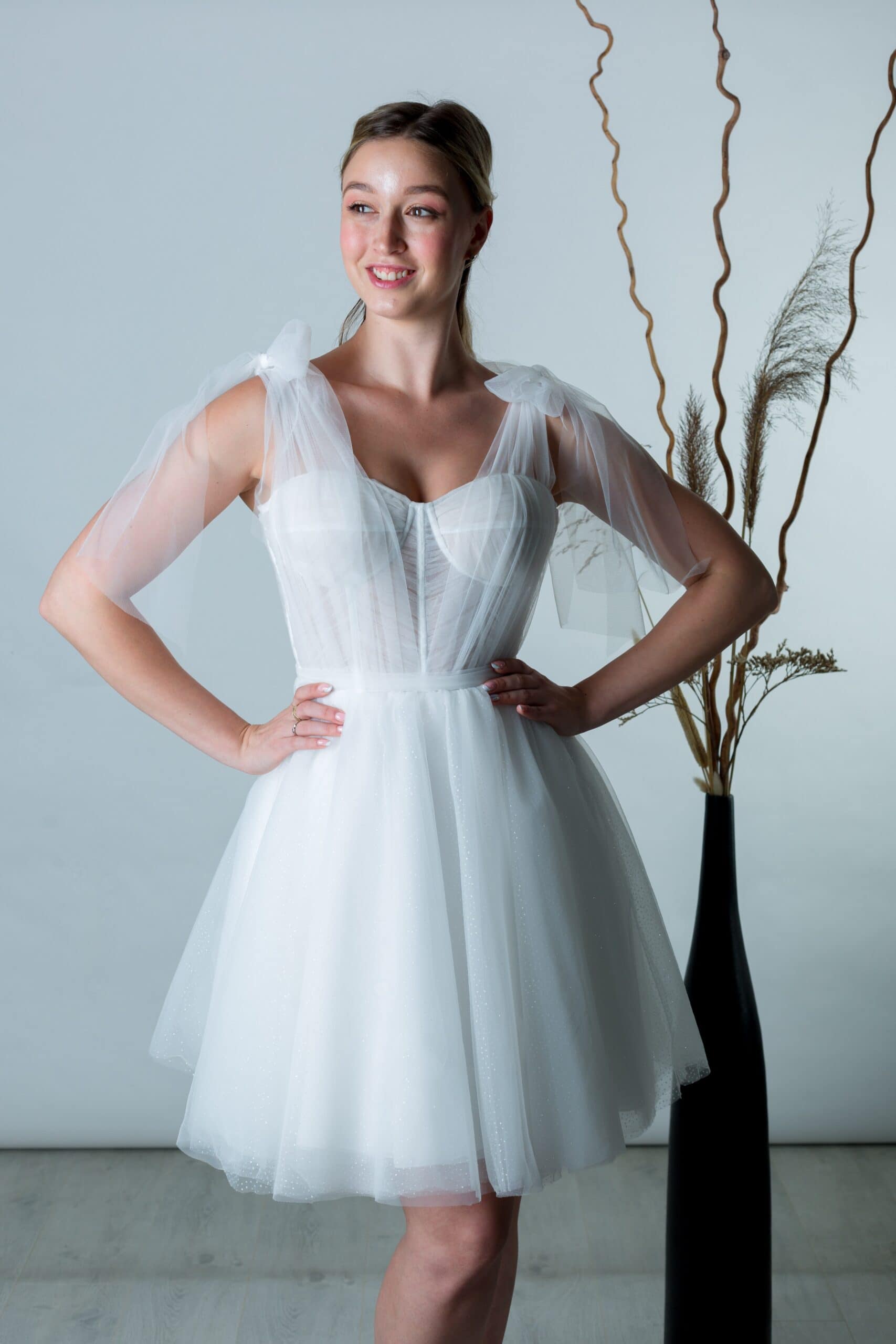 A Carmella egy különleges, balerina ihletésű rövid tüll menyasszonyi ruha, amely a könnyedséget és a romantikát ötvözi modern eleganciával. Ideális választás, ha polgári szertartásra, szabadtéri esküvőre vagy második menyasszonyi ruhaként keresel valami igazán különlegeset.