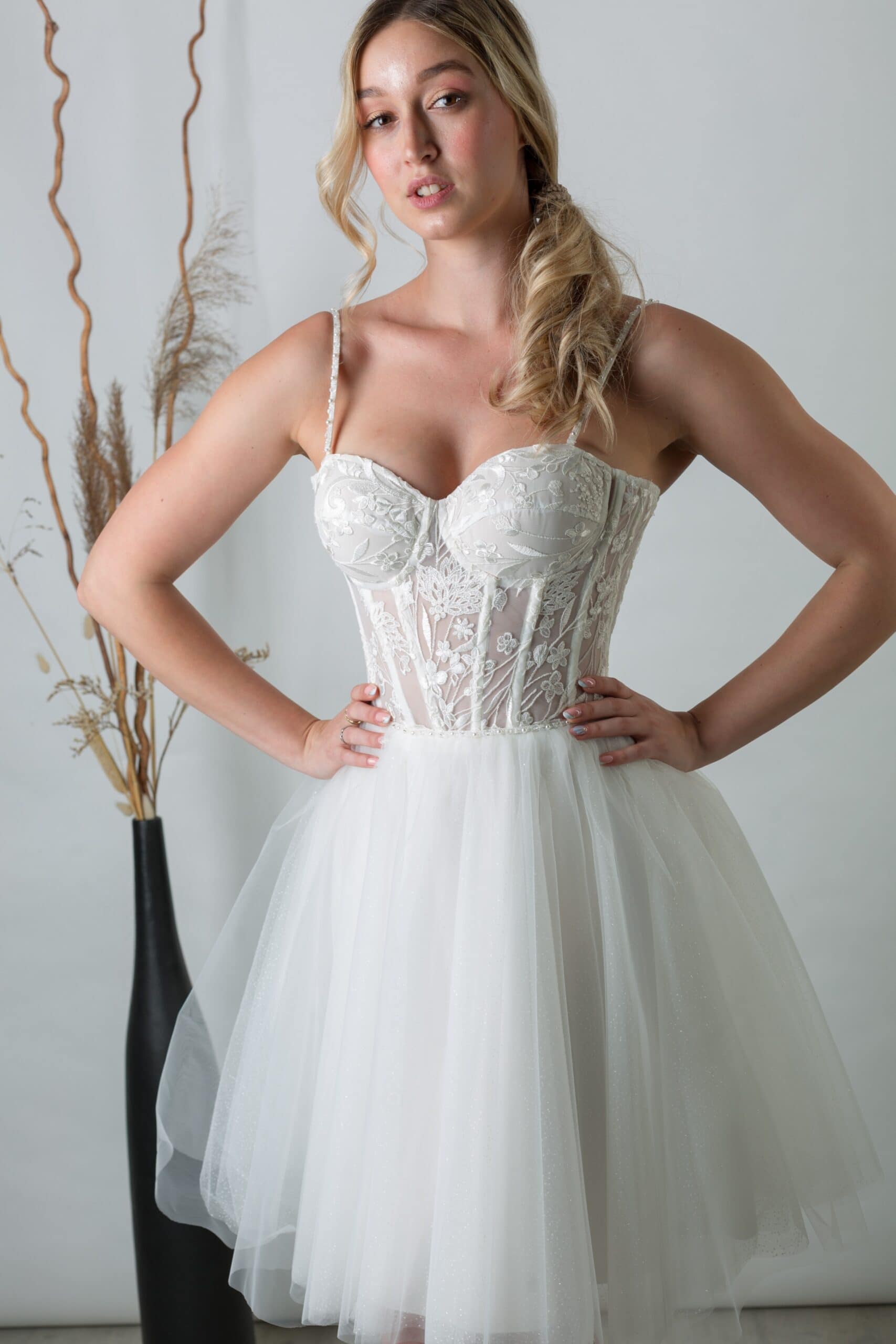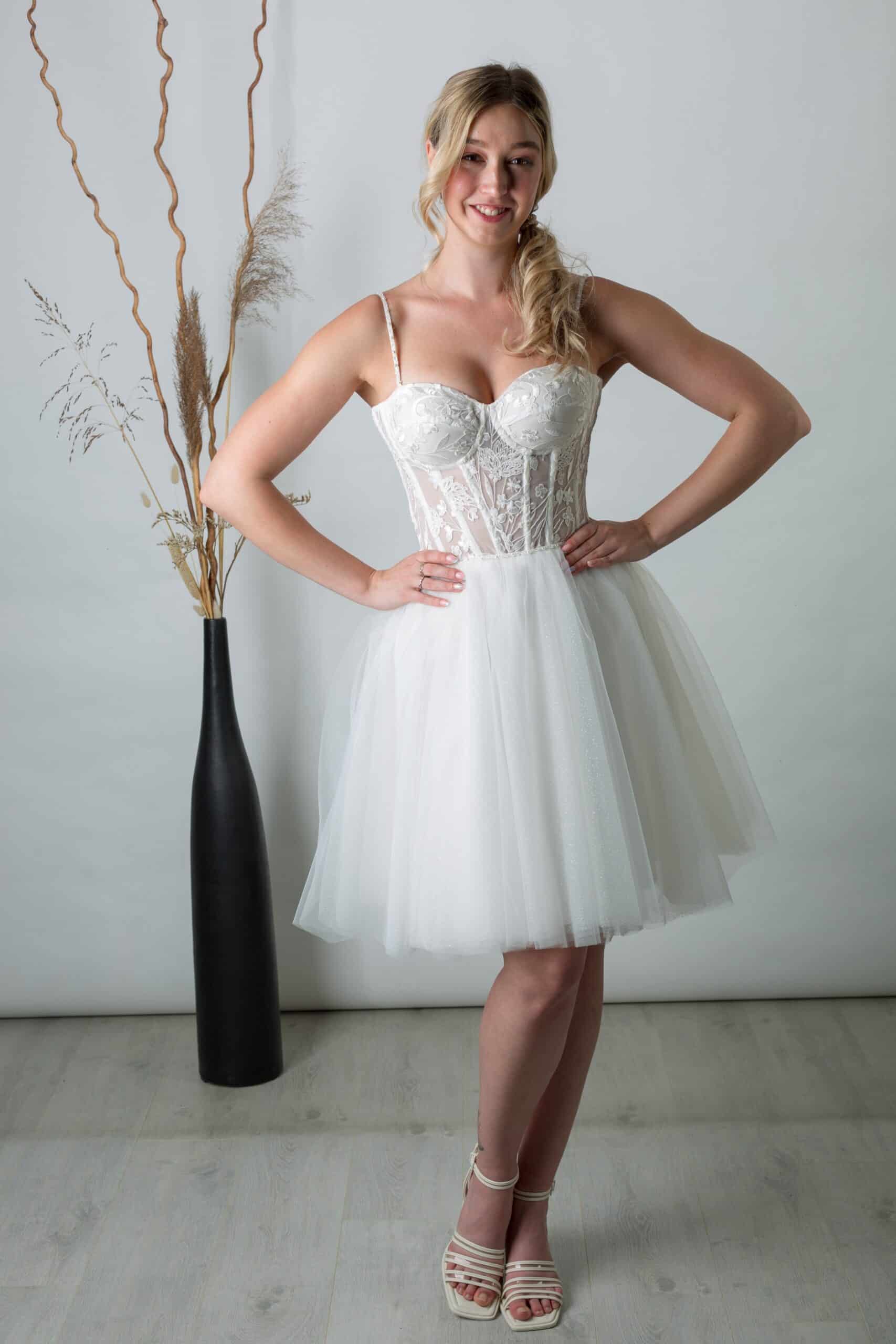 Az Eklektika Style Iza egy karakteres, mégis játékos rövid csipke menyasszonyi ruha, amely tökéletes választás polgári szertartásra, menyecskeruhának vagy egy modern, nyári esküvőre. Ez a modell azoknak a menyasszonyoknak szól, akik nem szeretnének hagyományos hosszú ruhát, mégis ragaszkodnak az elegáns, menyasszonyi megjelenéshez.