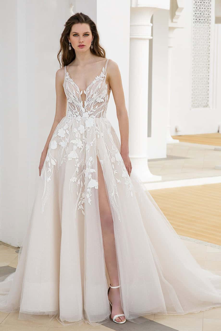 A Blue by Enzoani Rhapsody – Csillogó A-vonalú esküvői ruha sliccelt szoknyával egy látványos és romantikus menyasszonyi ruha az Enzoani kollekciójából. A modell most kiárusítás keretén belül érhető el. A csillám tüll borítás finom ragyogást ad a megjelenésnek. A virágos csipkével díszített felsőrész elegáns és nőies hatást kelt.