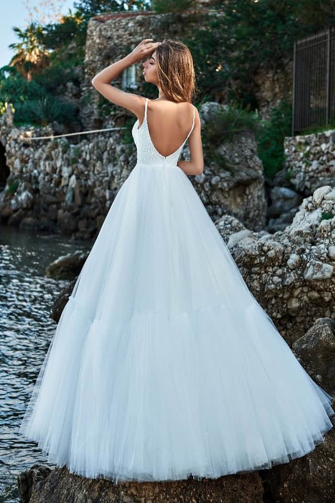 A mély, illúzió V-kivágás sejtelmesen emeli ki a dekoltázst, míg a nyitott hátmegoldás modern karaktert ad a ruhának. Ezek a részletek együtt teszik igazán izgalmassá a megjelenést anélkül, hogy túlzó lenne.