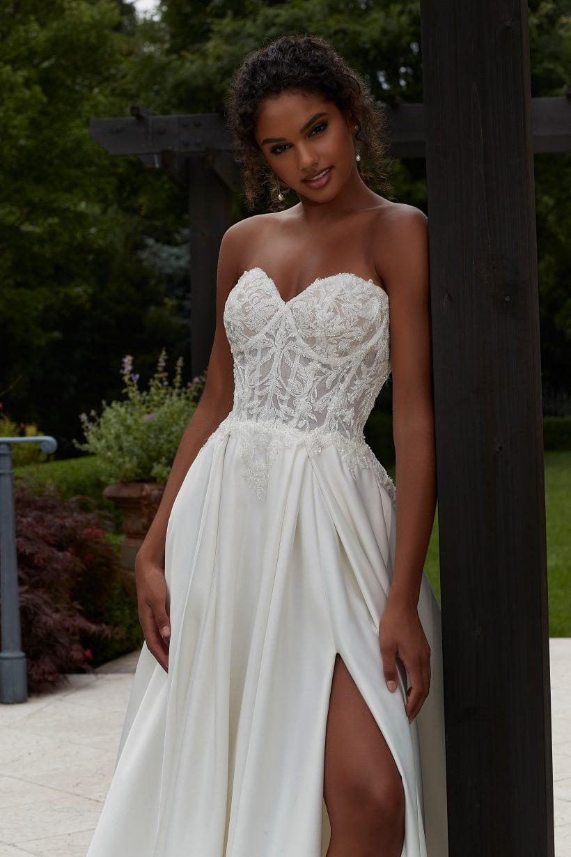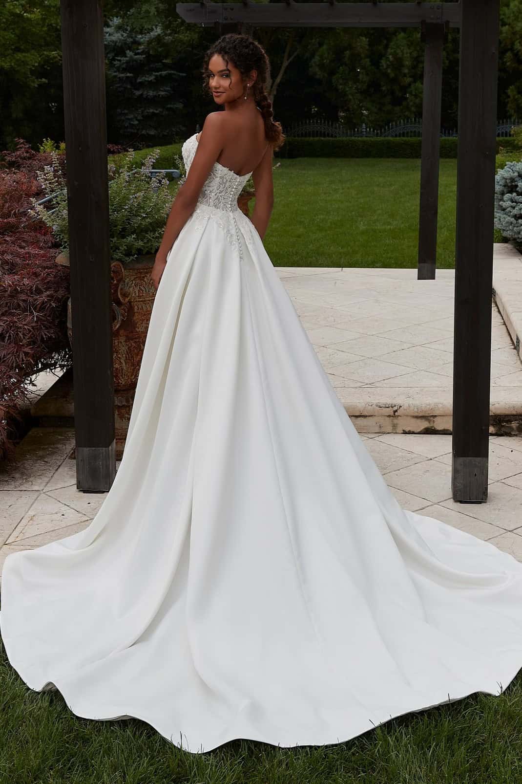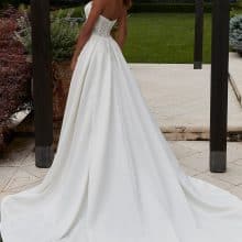 A szatén A vonal menyasszonyi ruha zsebbel egy csendes, mégis határozott állítás. Nem a részletek túlzásával hívja fel magára a figyelmet, hanem az arányok tökéletességével, a vonalak tisztaságával és az anyag eleganciájával.