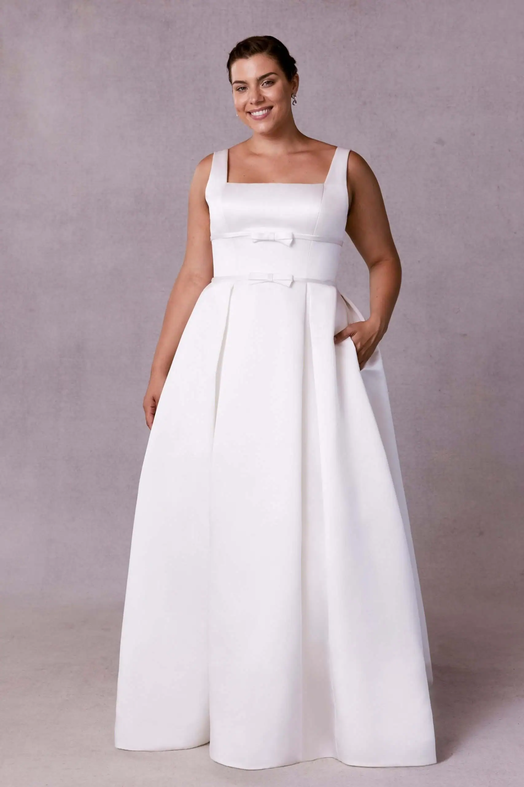 A Morilee „Sway” menyasszonyi ruha az elegancia és kifinomultság tökéletes példája. Ez a plus size fazon a klasszikus A-vonalú szabást ötvözi a modern minimalizmus bájával, miközben hangsúlyozza az alak természetes szépségét. A fényes szatén anyag különleges ragyogást kölcsönöz a ruhának, miközben a szögletes dekoltázs és a széles pántok időtálló, letisztult megjelenést biztosítanak.
