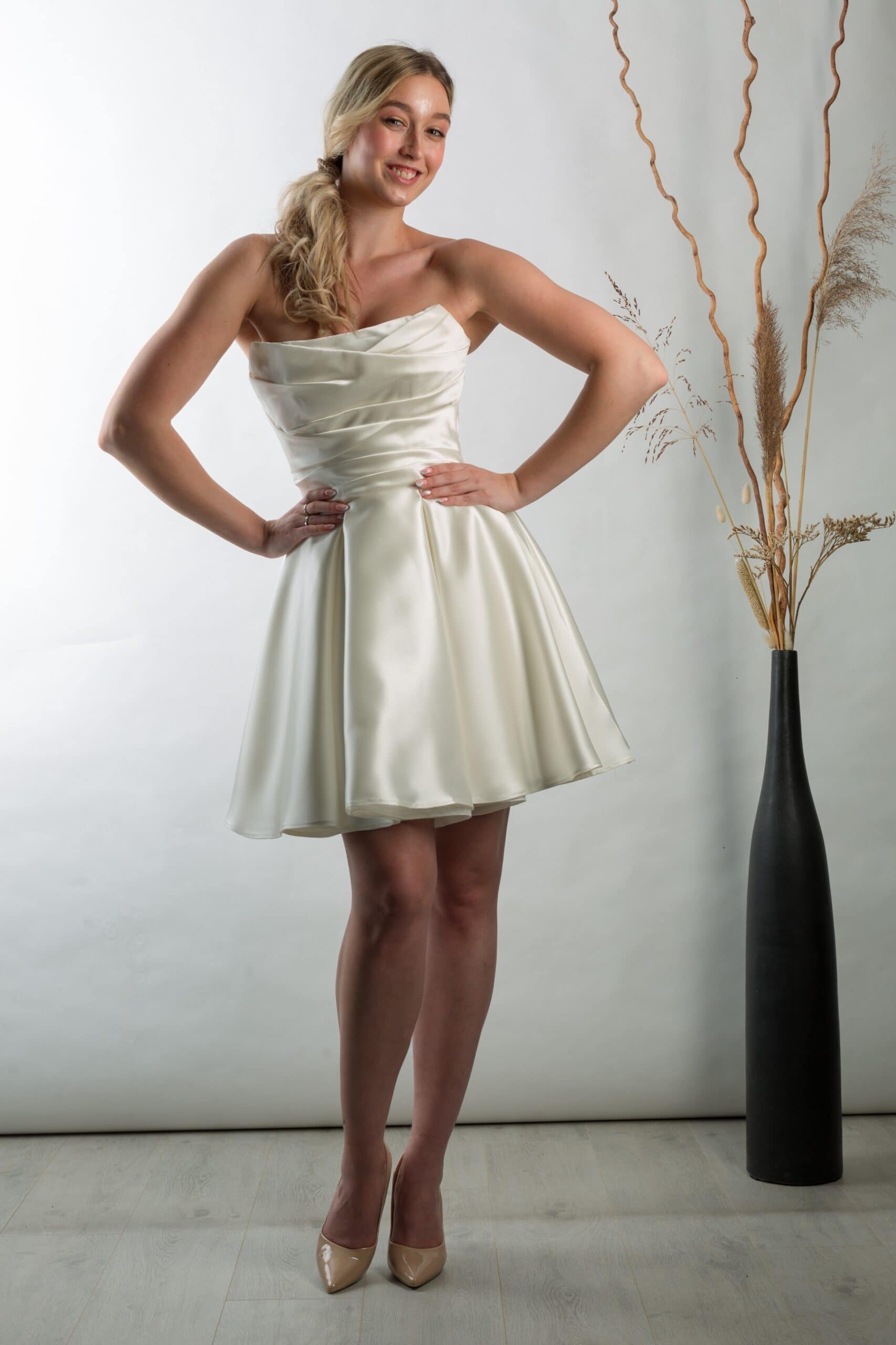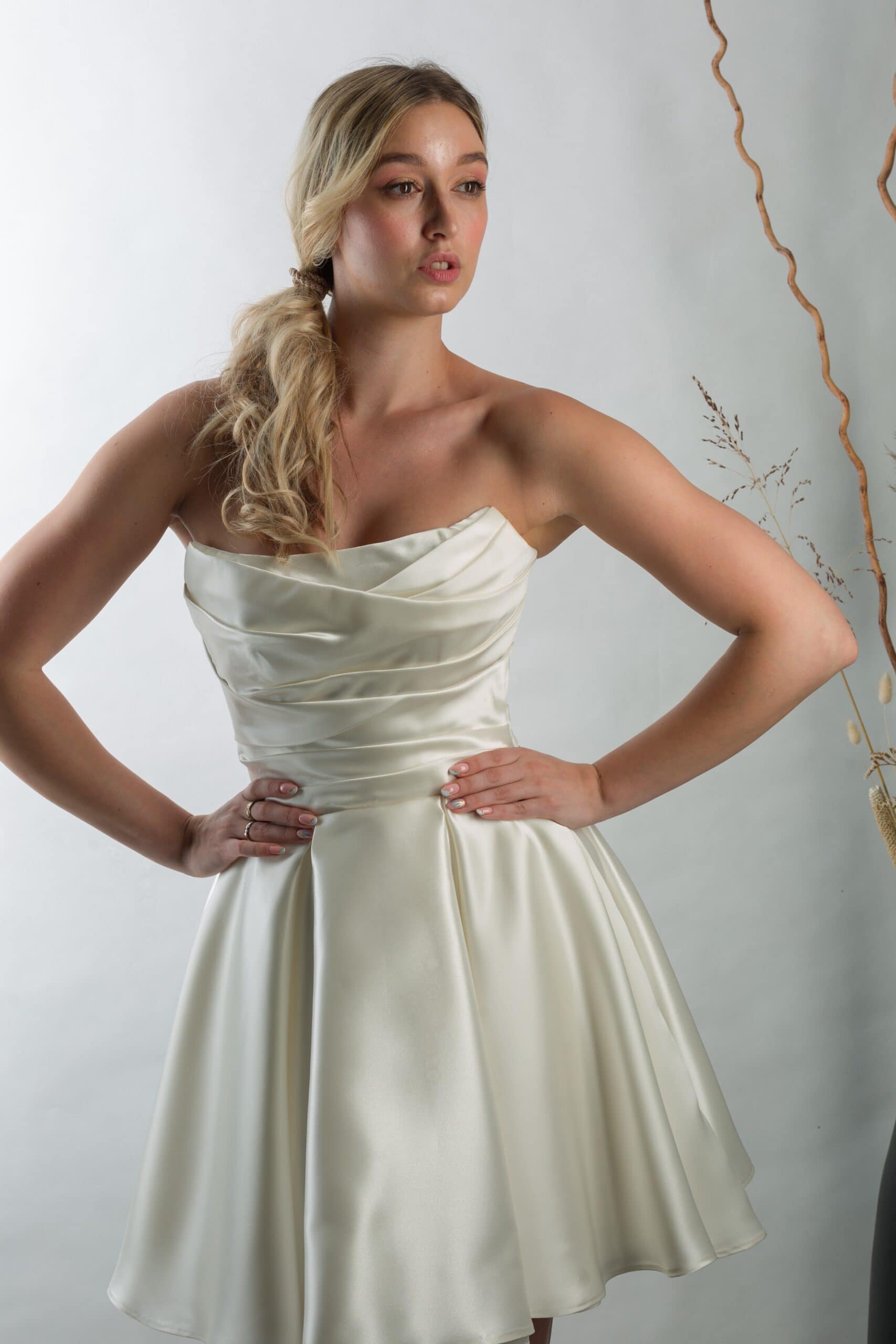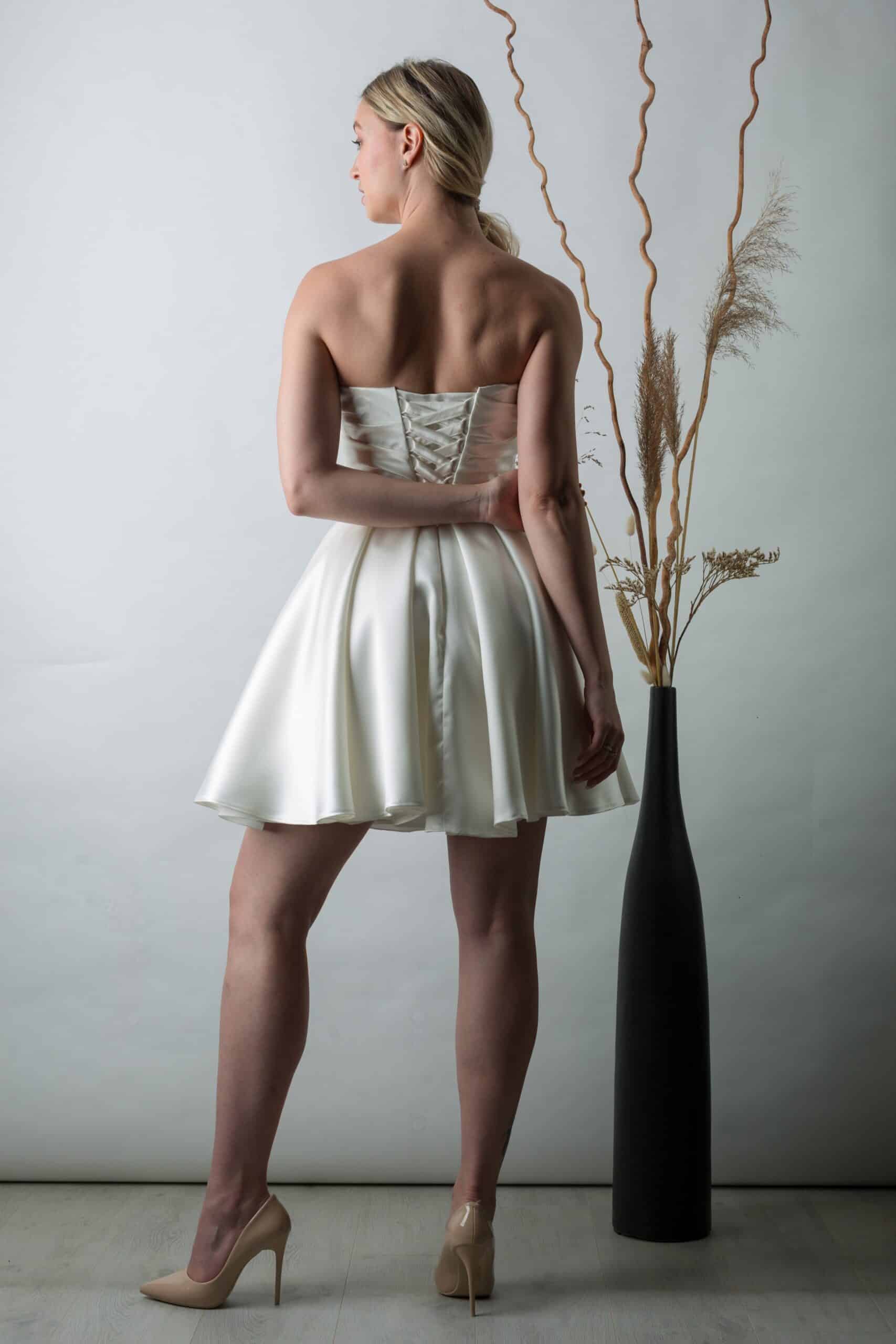 A szatén rövid menyasszonyi ruha polgári esküvőre ideális választás, ha elegáns, mégis könnyed megjelenést szeretnél. Az Eklektika Style Olívia modell a klasszikus stílust modern részletekkel ötvözi. Letisztult, ünnepi és időtálló.