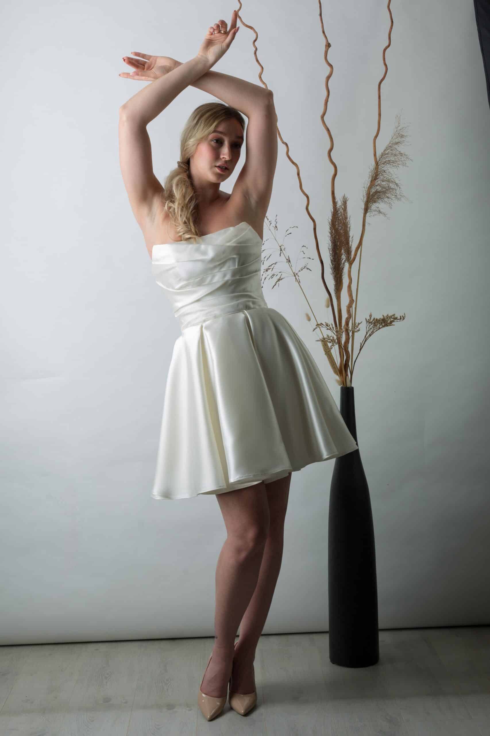 A fényes, hófehér szatén anyag finoman tükrözi a fényt. Mozgás közben lágy ragyogást ad a megjelenésednek. Ez a szatén rövid menyasszonyi ruha polgári esküvőre különösen jól mutat nappali szertartáson. Városházi ceremóniára és szabadtéri esküvőre is tökéletes.