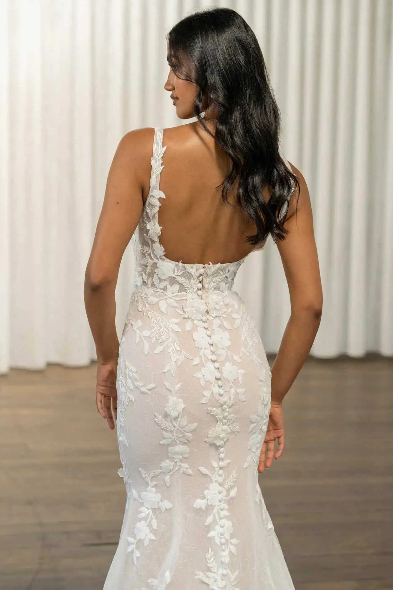 A sellő fazonú szabás és a függőlegesen ívelt csipkeminta vizuálisan nyújtja és formálja az alakot, így a menyasszony tökéletesen magabiztosan léphet az oltár elé. A mély hátkivágás érzéki és kifinomult hatást kelt, amelyet a magasra húzódó gombolás és a csipkés vállpántok biztosítanak. Ezek nemcsak esztétikai elemek, hanem gondoskodnak a tökéletes illeszkedésről és a kényelemről is.