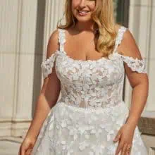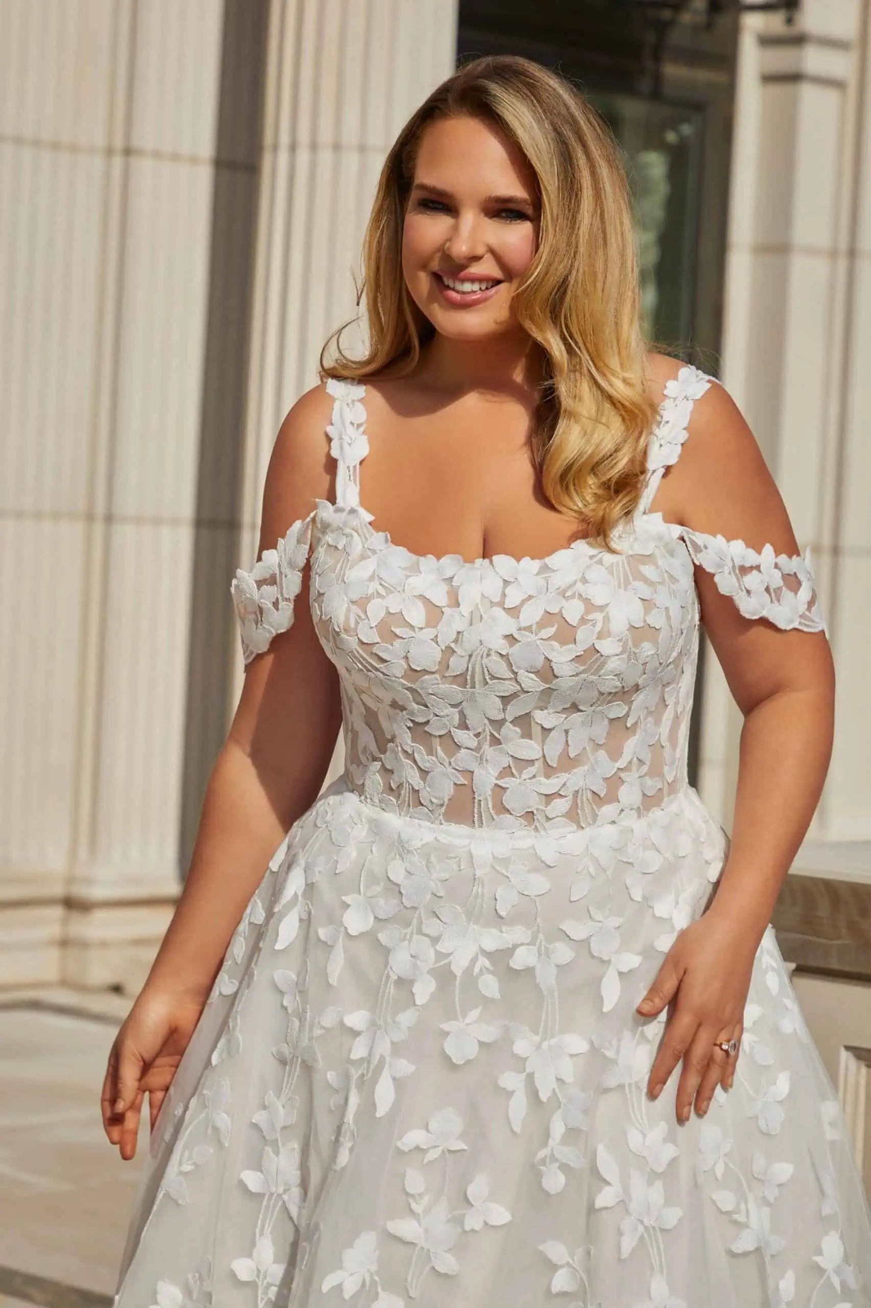 Az A-vonalú hímzett plus size menyasszonyi ruha ideális választás azoknak a menyasszonyoknak, akik egyszerre keresnek kényelmet, nőiességet és látványos megjelenést. A Morilee Theresa modell kifejezetten molett alkatra tervezett szabásvonalával magabiztos viseletet biztosít a nagy napon.