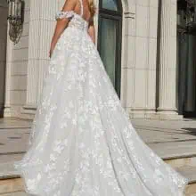A ruha teljes felületén hímzett, finom tüll anyagból készült, amely romantikus, légies összhatást kelt. Az A-vonalú fazon karcsúsítja a derékvonalat, miközben harmonikusan követi a test vonalait, így az egyik legelőnyösebb választás a plus size menyasszonyi ruhák között.